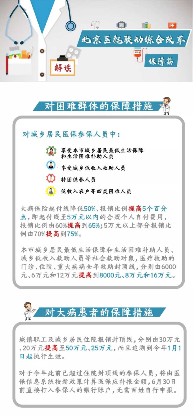 根据测算,改革后北京市医疗费用总量基本平衡,考虑到医保报销政策,门诊患者费用基本持平,住院患者费用略有增加。但对患者个体而言,不同疾病患者费用有降有升,比如使用高值耗材较多的病种,费用可能会下降;以技术劳务治疗项目为主的病种,费用可能会有所增加。对此,相关部门已进行细化分析,对由于价格调整可能引起费用涨幅明显的病种,通过控费、医保政策结合救助政策予以解决,保障低收入家庭及困难群体负担稳定在可负担水平。